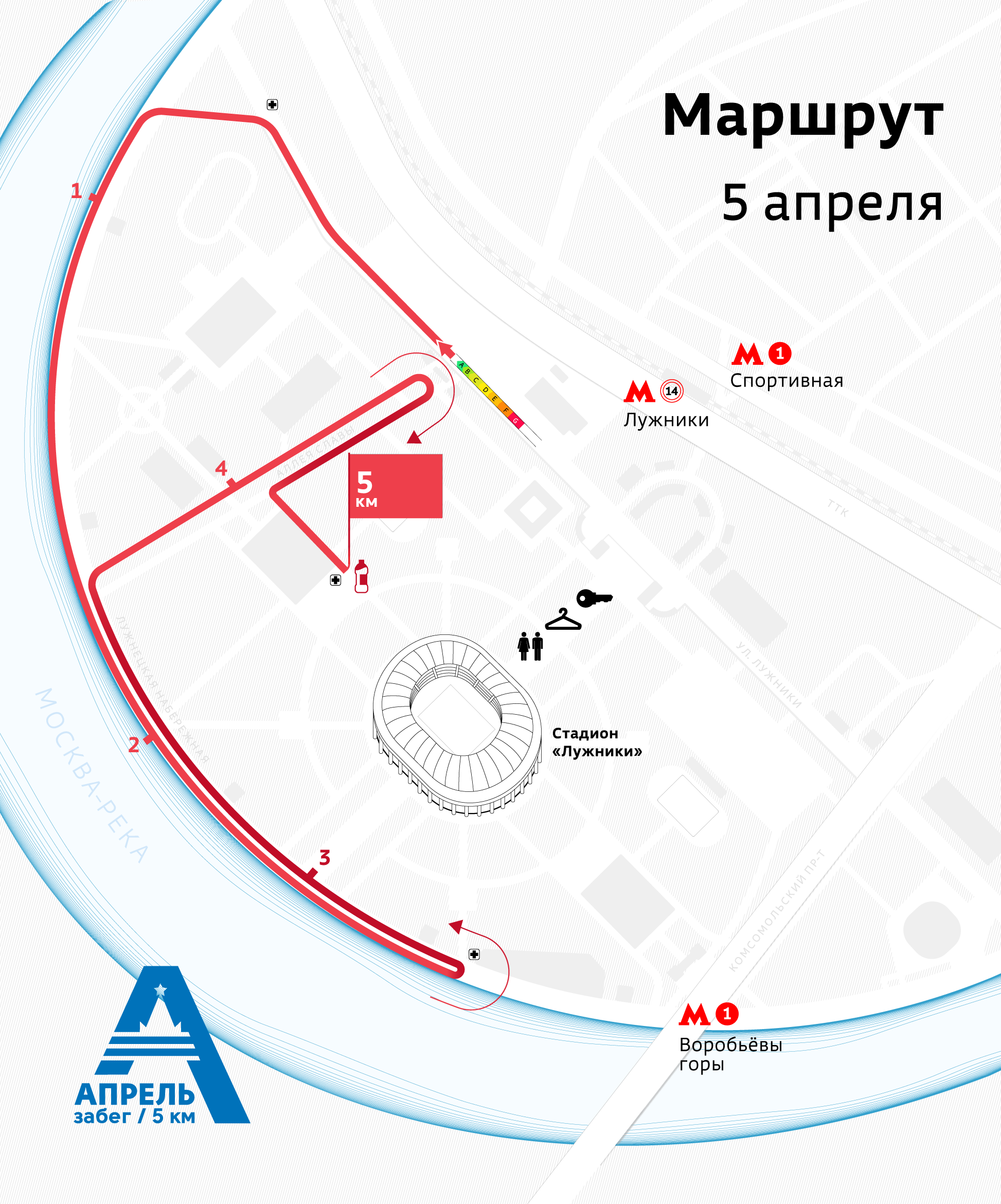 Маршрут забега «Апрель» проходит по территории Олимпийского комплекса «Лужники». Старт будет дан на улице Лужники, маршрут пройдёт по Лужнецкой набережной, по аллее Славы и завершится около Малой спортивной арены. Участникам откроются виды на Воробьёвскую набережную, здание МГУ и Большую спортивную арену «Лужники».