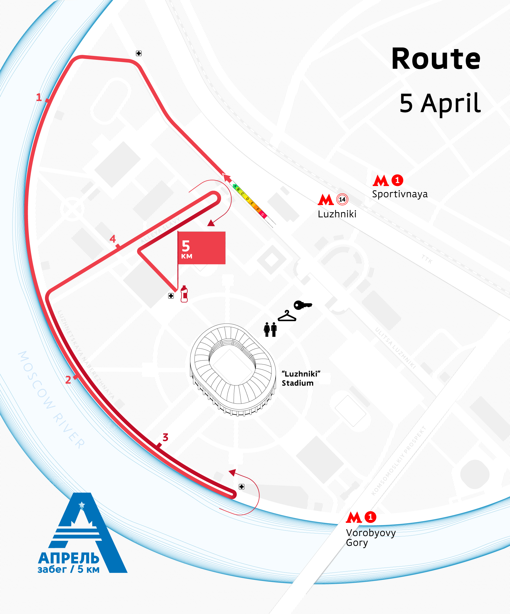 The April Run route passes at the Luzhniki Olympic Complex. Starting on Luzhniki Street, the route will wind along Luzhnetskaya Embankment, the Slavy Alley, and finish near the Small Sports Arena. Participants will enjoy views of the Vorobyevskyaya Embankment, Moscow State University building and the Grand Sports Arena «Luzhniki».