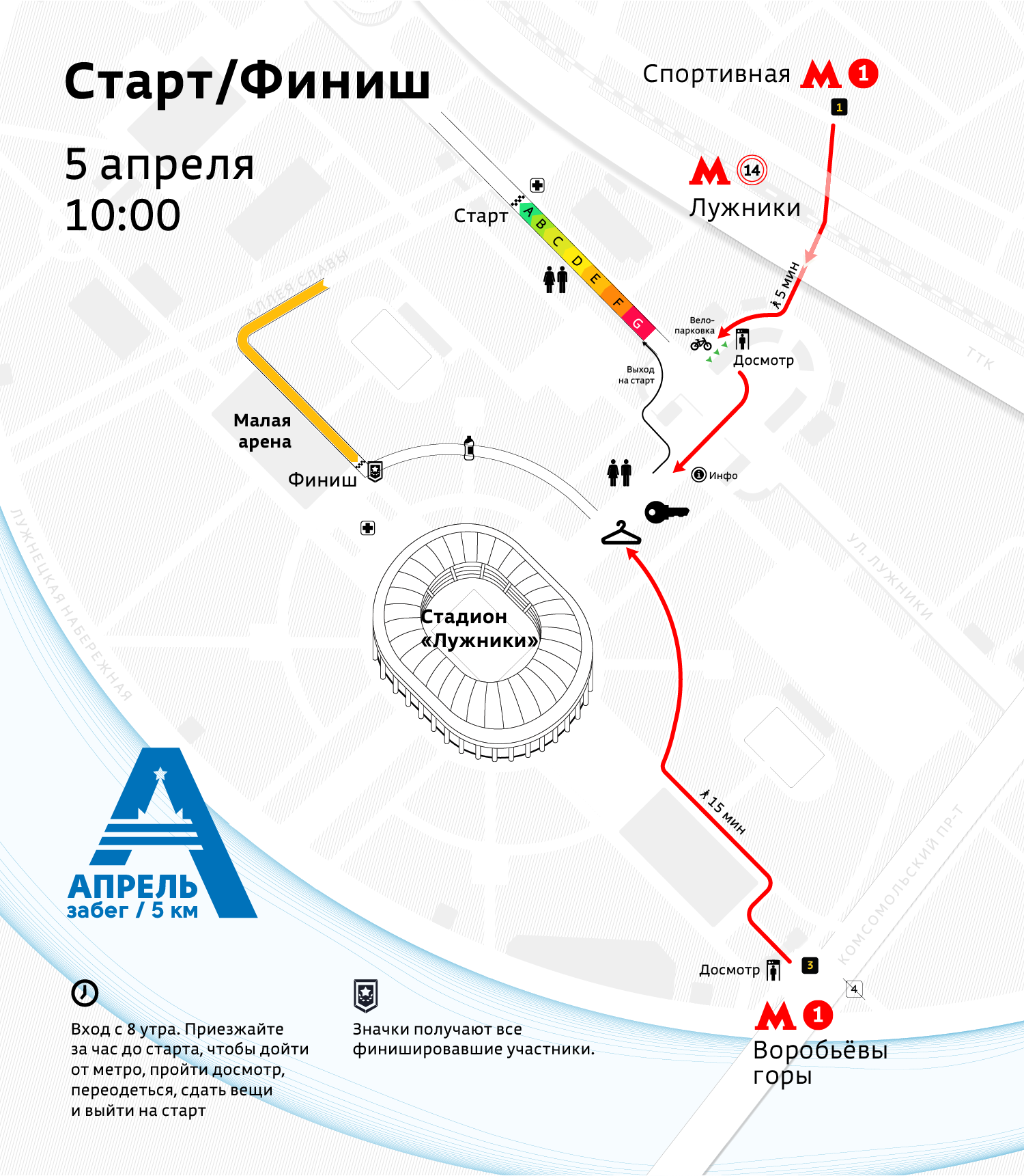 Стартово-финишный городок расположен на Центральной площади на территории Олимпийского комплекса «Лужники».