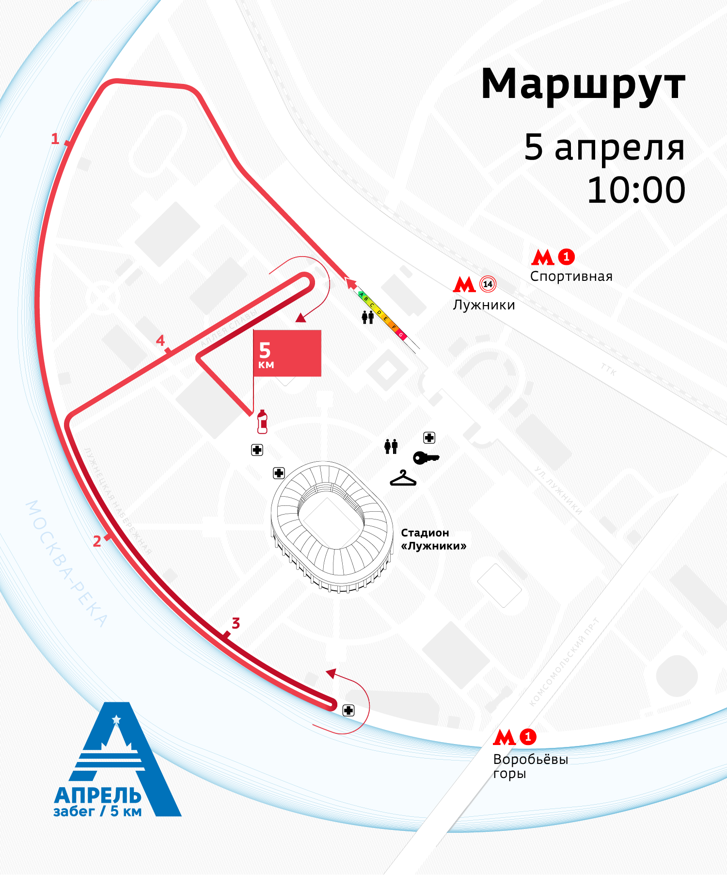 Маршрут забега «Апрель» проходит по территории Олимпийского комплекса «Лужники». Старт будет дан на улице Лужники, маршрут пройдёт по Лужнецкой набережной, по аллее Славы и завершится около Малой спортивной арены. Участникам откроются виды на Воробьёвскую набережную, здание МГУ и Большую спортивную арену «Лужники».